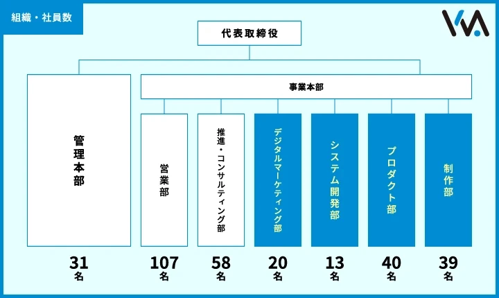 当社の社員数は377名(2025年10月末時点)。そのうち、クリエイティブ・マーケティング担当部署には112名が在籍しています。クリエイティブ・マーケティングを担当する部署は、デジタルマーケティング部・システム開発部・プロダクト部・制作部の4つの部門で構成されており、それぞれが専門性を活かして業務を遂行しています。