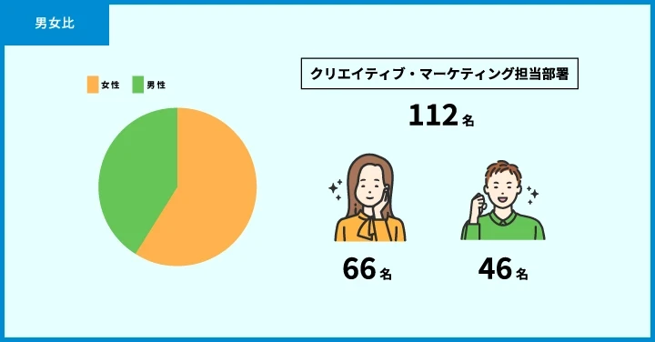 クリエイティブ・マーケティング担当の男女比は、女性が66名、男性が46名と女性比率がやや高くなっています。女性が活躍しやすい環境が整っていることが特徴です。