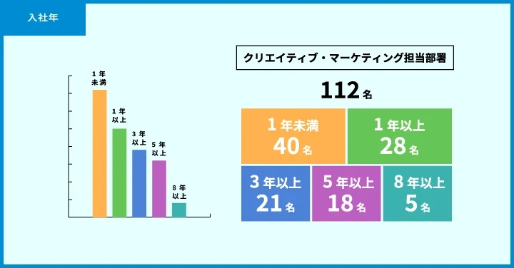 株式会社WeeAreのマーケティング本部は、20代が多く、女性比率が高いのが特徴です。全体の平均残業時間は1.5時間と、比較的働きやすい環境が整っています。また、新しいメンバーが多く活躍する一方、経験豊富な社員も在籍し、バランスの取れた組織になっています。
